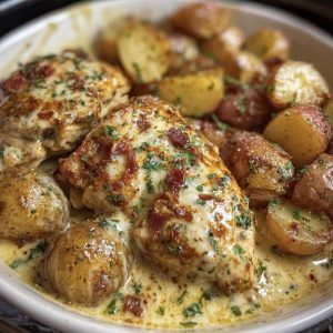 Pour the garlic-Parmesan cream sauce evenly over the chicken and potatoes. -